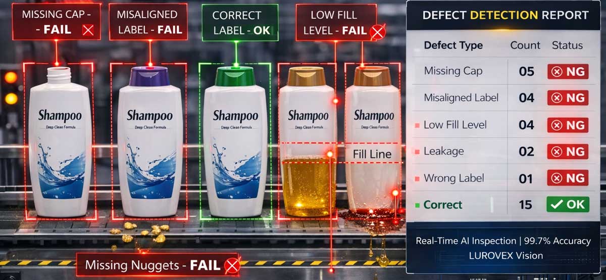 Ensure flawless product packaging and eliminate production defects with our AI-powered Bottle Inspection System. Designed for high-speed manufacturing lines, this intelligent solution detects packaging and filling errors in real time and generates automated defect detection reports with up to 99.7% accuracy.
