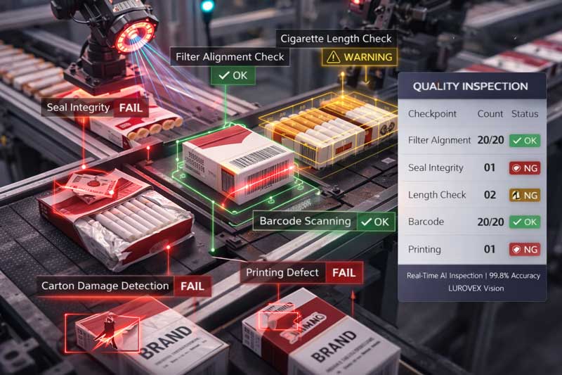 Ensure product integrity, regulatory compliance, and brand protection with our AI-powered Tobacco Packaging Inspection System. Designed for high-speed production lines, this intelligent solution performs real-time quality checks on cigarette packs, cartons, and printed materials with up to 99.8% accuracy.